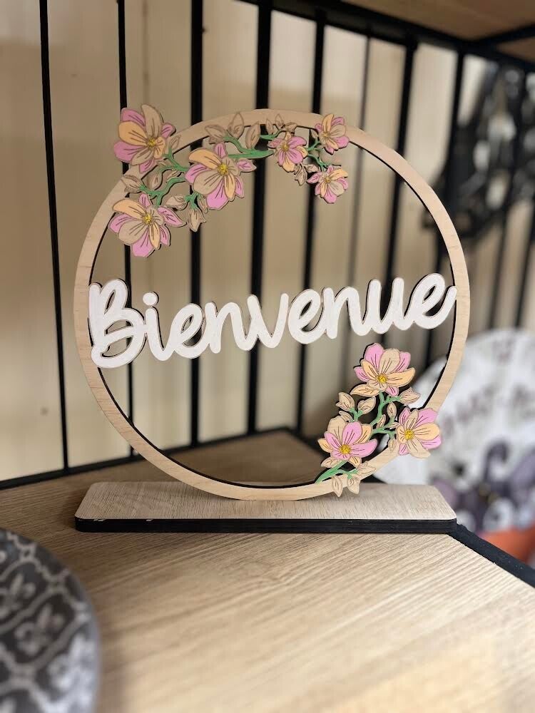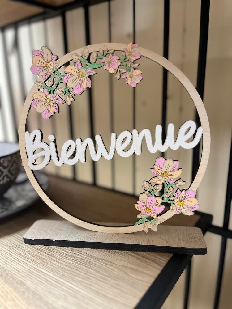 Couronne bois 3mm d'epaisseur 30cm de diamètre avec fleur